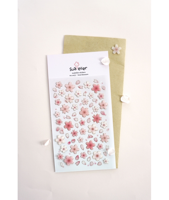 Une planche de stickers autocollants kawaii de la marque SUATELIER. Décorez votre carnet, journal, téléphone... Avec d'adorables petites fleurs de cerisiers en PVC.
